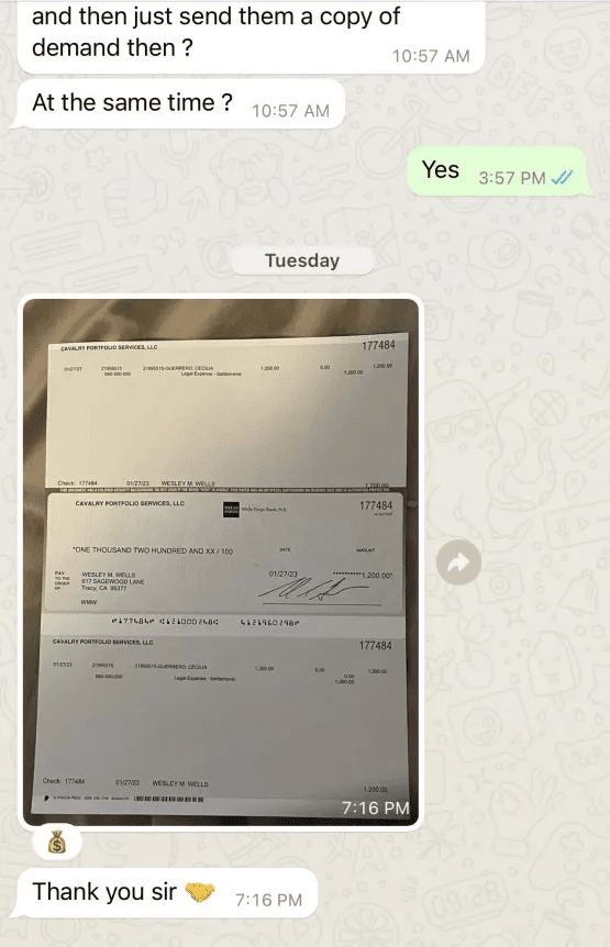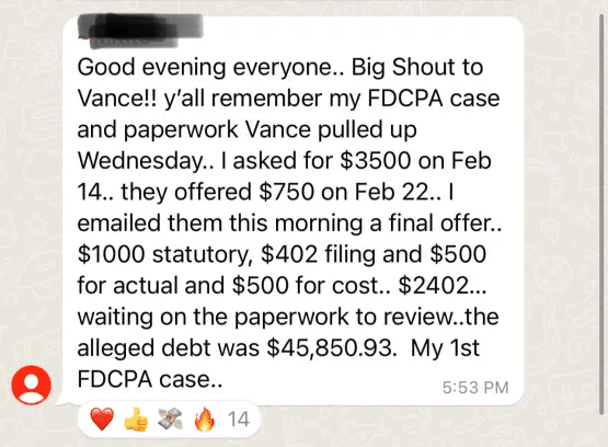 "The attorney reached out to me from the debt collector and after 72 hours of work, the check arrived today for $1,402. This is my first monetary victory and if you guys have any doubt in what Vance has to offer, he’s the real deal. He made it very easy for me to dissect what he was saying"